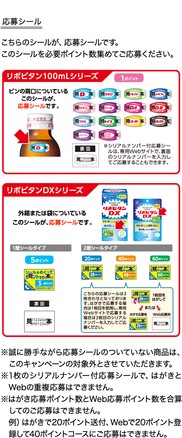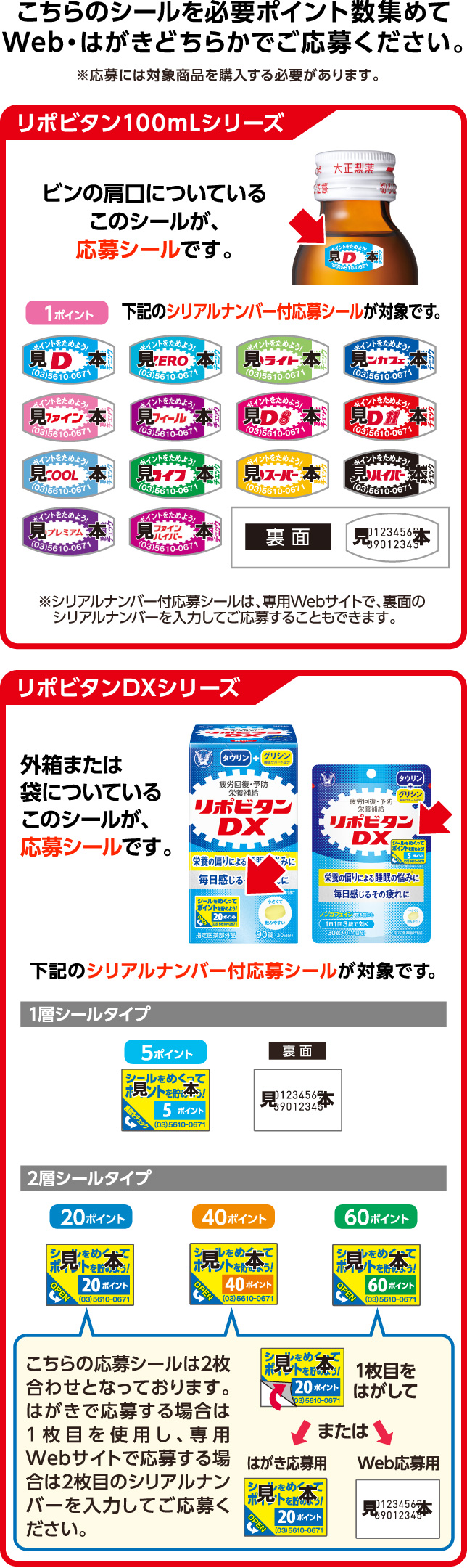 本Webサイト(リポビタンポイントチャージステーション)で会員登録をしていただき、対象商品についている「応募シール」をご希望賞品のポイント分集め、シール裏面に記載されたシリアルナンバーをポイント登録画面より入力いただきご応募ください。