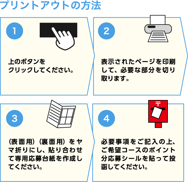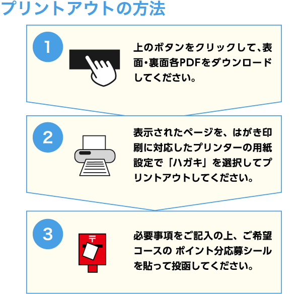 - ※専用応募台紙以外でご応募される場合は、必ず1枚の郵便はがき等に応募シールをご希望賞品のポイント分貼り、郵便番号・住所・氏名(フリガナ)・性別・年齢・電話番号・メールアドレス(任意)をご記入のうえご応募ください。ご記入は黒のボールペンをご使用ください。