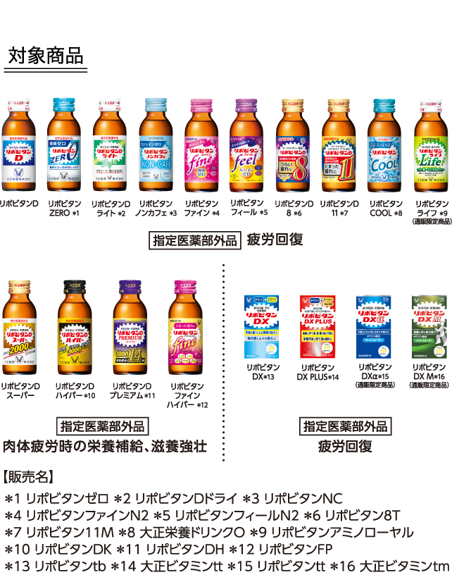 ポイント登録ができる対象商品(※2025年12月現在)は、リポビタンD、リポビタンZERO、リポビタンDライト、リポビタンノンカフェ、リポビタンファイン、リポビタンフィール、リポビタンD8、リポビタンD11、リポビタンCOOL、リポビタンライフ、リポビタンDスーパー、リポビタンDハイパー、リポビタンDプレミアム、リポビタンファインハイパー、リポビタンDX、リポビタンDX PLUS、リポビタンDXα、リポビタンDX Mです。