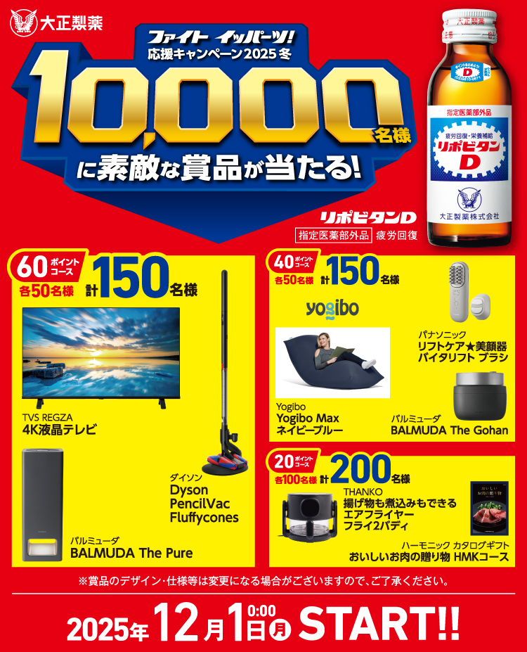 - ・ご記入いただいた個人情報は、適切に管理し、当社の他のキャンペーンとの重複当選の確認、賞品の発送、リポビタンやリポビタン以外の製品に関するキャンペーン・サービス等のご案内に利用させていただきます。また個人を特定しない統計情報に活用させていただく場合もございます。