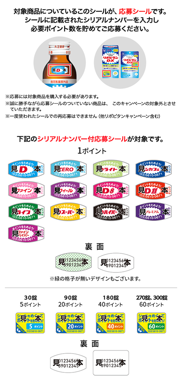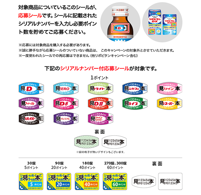 リポビタンポイントチャージステーションの会員登録をしていただき、対象商品のシール裏面等に記載されたシリアルナンバーを登録画面より入力の上、ご応募ください。