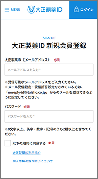 新規登録画面より、メールアドレスをご入力いただき、利用規約に同意の上、仮登録をクリック。認証コードの確認メールが送信されます。