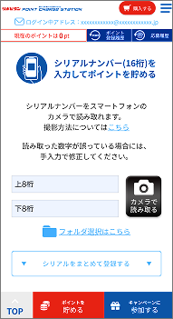 画面右側下部の「ポイントを貯める」をクリックし、「シリアルナンバー(16桁)を入力してポイントを貯める」から、シールに記載された上8桁・下8桁の合計16桁の数字を入力します。